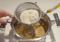 Settacciate la farina e la vanillina sul composto, amalgamate il tutto e aggiungete il latte mescolando con una frusta manuale.
